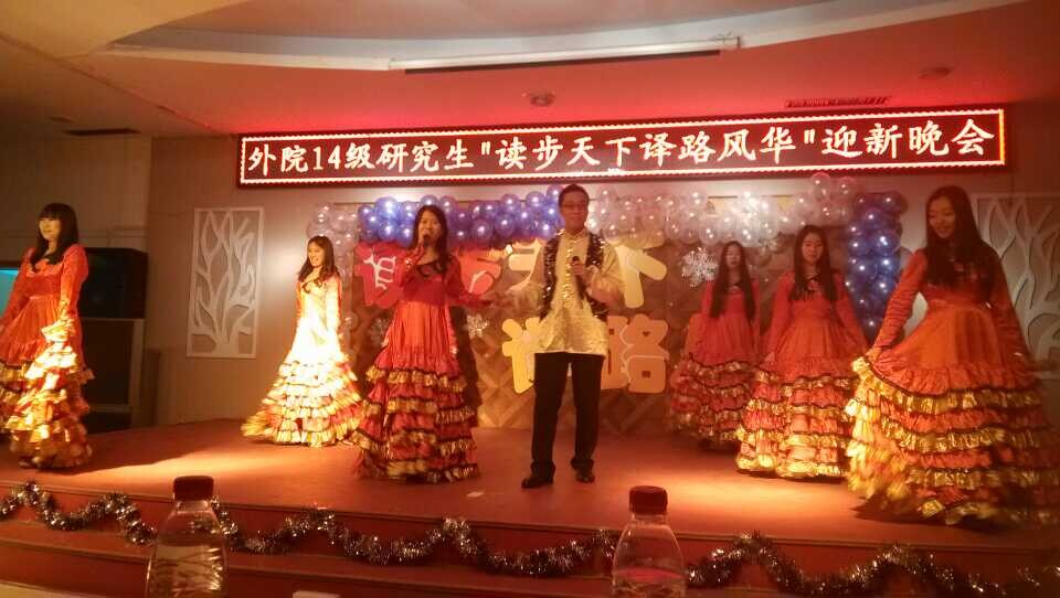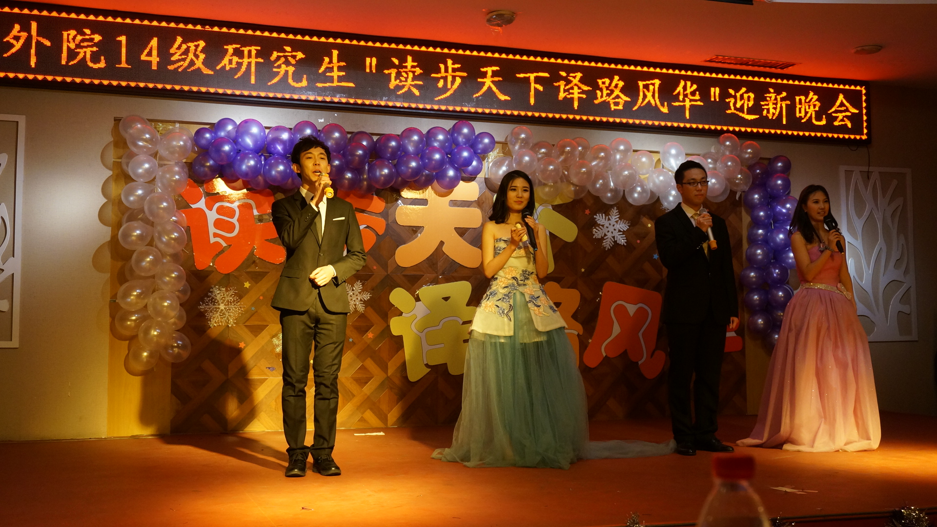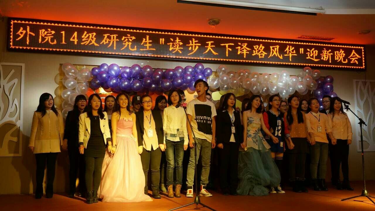 2014级研究生“读步天下,译路风华”主题迎新晚会于11月30日晚18:00,在中心校区莘子园三楼成功举办。周异夫院长、逄锦彩书记和学院的部分教师、校研会副主席彭海同学、2014级全体研究生以及2012级、2013级学生代表参加了晚会。