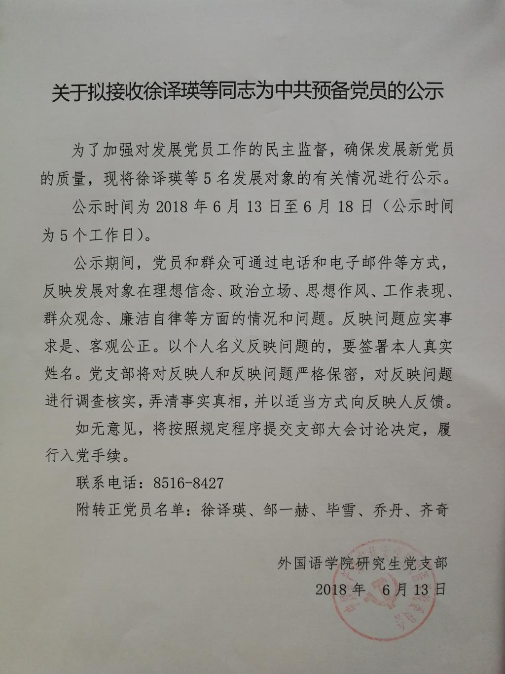 关于拟接收徐译瑛等同志为中共预备党员的公示