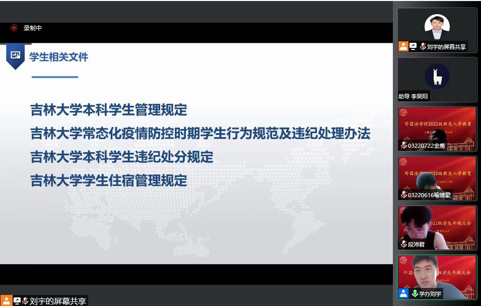 召开2022级新生年级大会。学院2022级新生辅导员刘宇主持,2022级全体学生参会。
