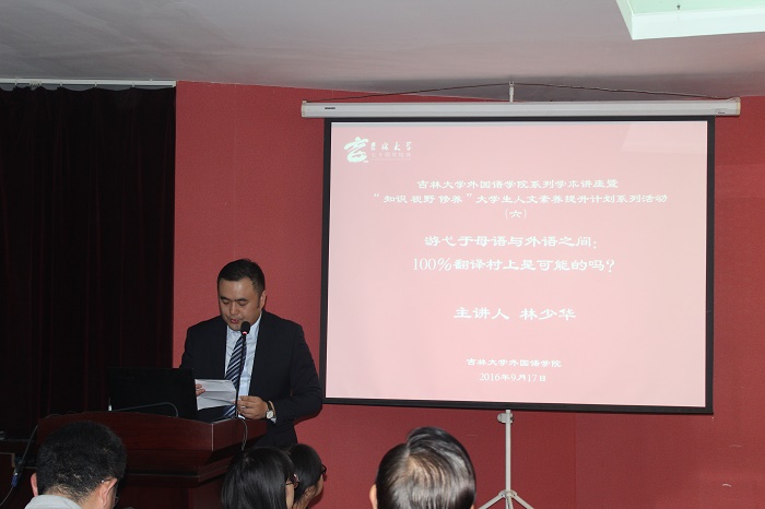 本次讲座主题为“游弋于母语与外语之间:100%翻译村上是可能的吗?”讲座开始前,周异夫院长对林少华教授的学术成就做了高度评价,并提出翻译是译者对原作的诠释,称赞林少华的译作在反映了村上春树语言特点的同时,糅合了自己的语言风格。在讲座中,林少华讲述了自己在研究生考试中深得恩师王长新赏识的故事,并以游子归家作比,表达了自己对欧美色情片