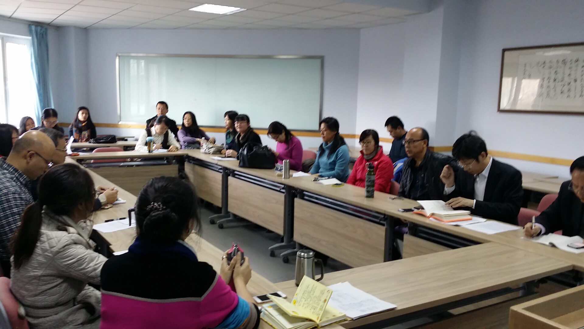 在外语楼216室召开了本学期研究生培养工作研讨会。院长周异夫、各业务副院长、各系主任、副主任、以及全院12个学位授权点的研究生导师和授课教师参加了研讨会。会议由分管研究生工作的副院长张玫玫主持。