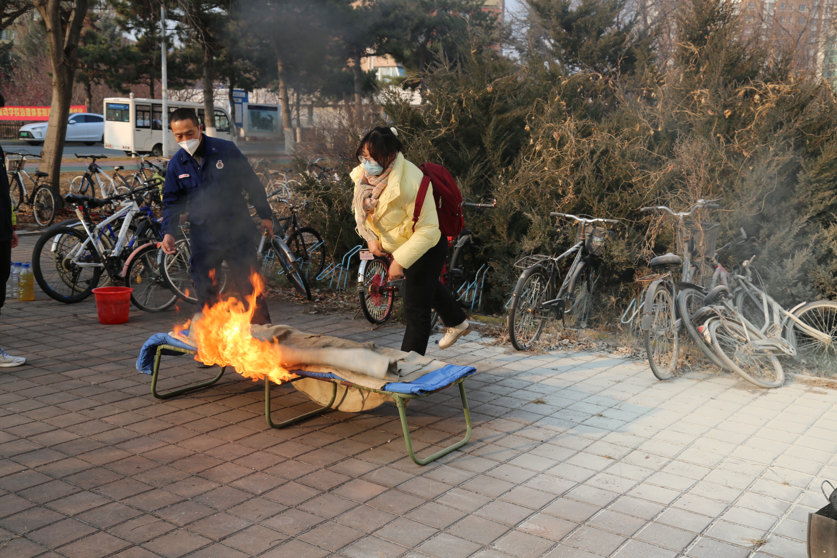 讲座结束后,消防科工作人员组织两学院师生进行了消防疏散演练,分别演示了灭火器、灭火毯等消防器材的使用方法,并带着现场师生进行了实际操作,使师生们真正掌握了逃生技能与灭火要领。