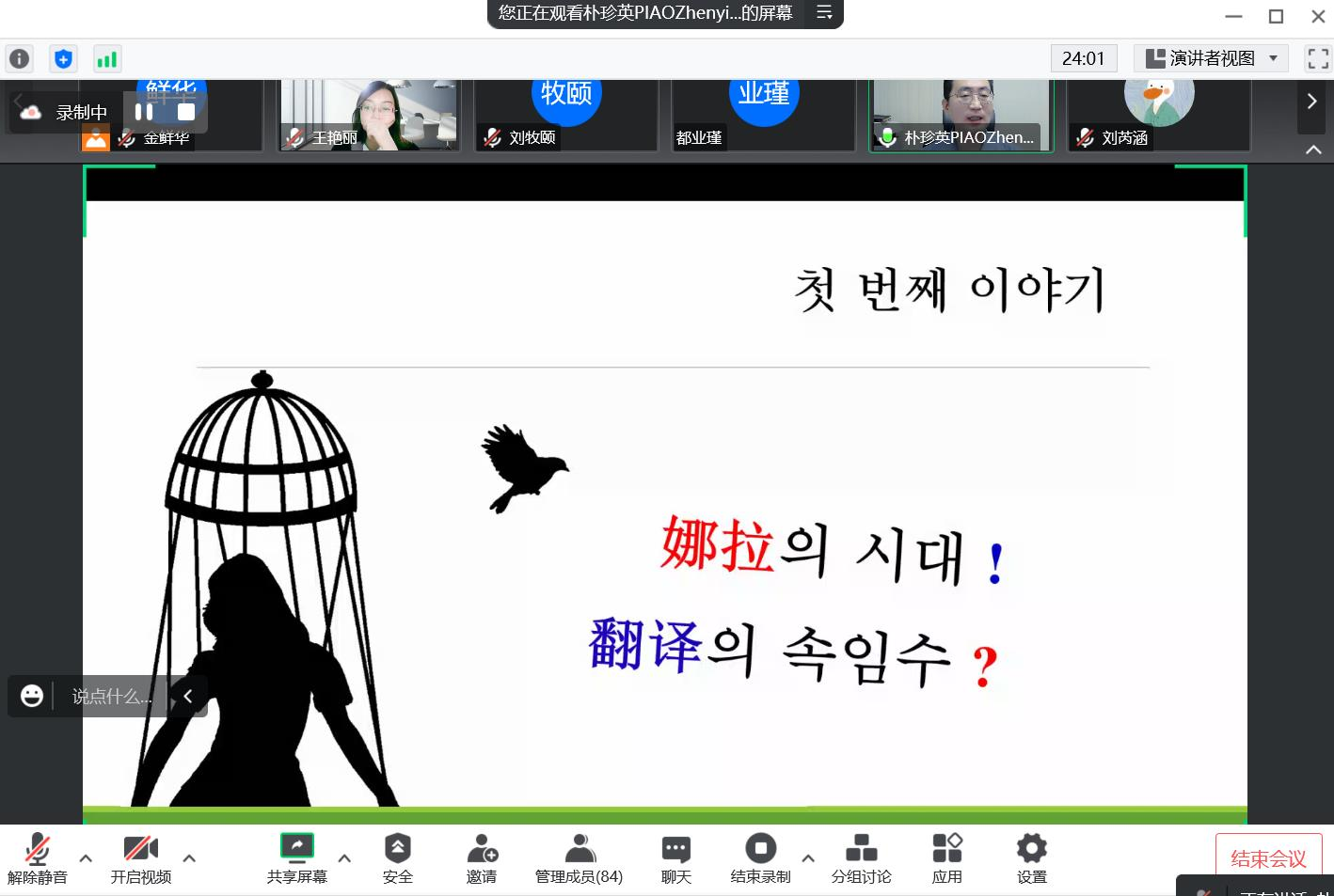 邀请,成均馆大学比较文化研究所长、成均馆大学国语国文学科朴珍英副教授在云端通过腾讯会议平台以“翻译与东亚女性”为主题进行了2个小时的学术讲座,讲座由朝文系教师王艳丽主持,参加讲座的人员有欧美色情片