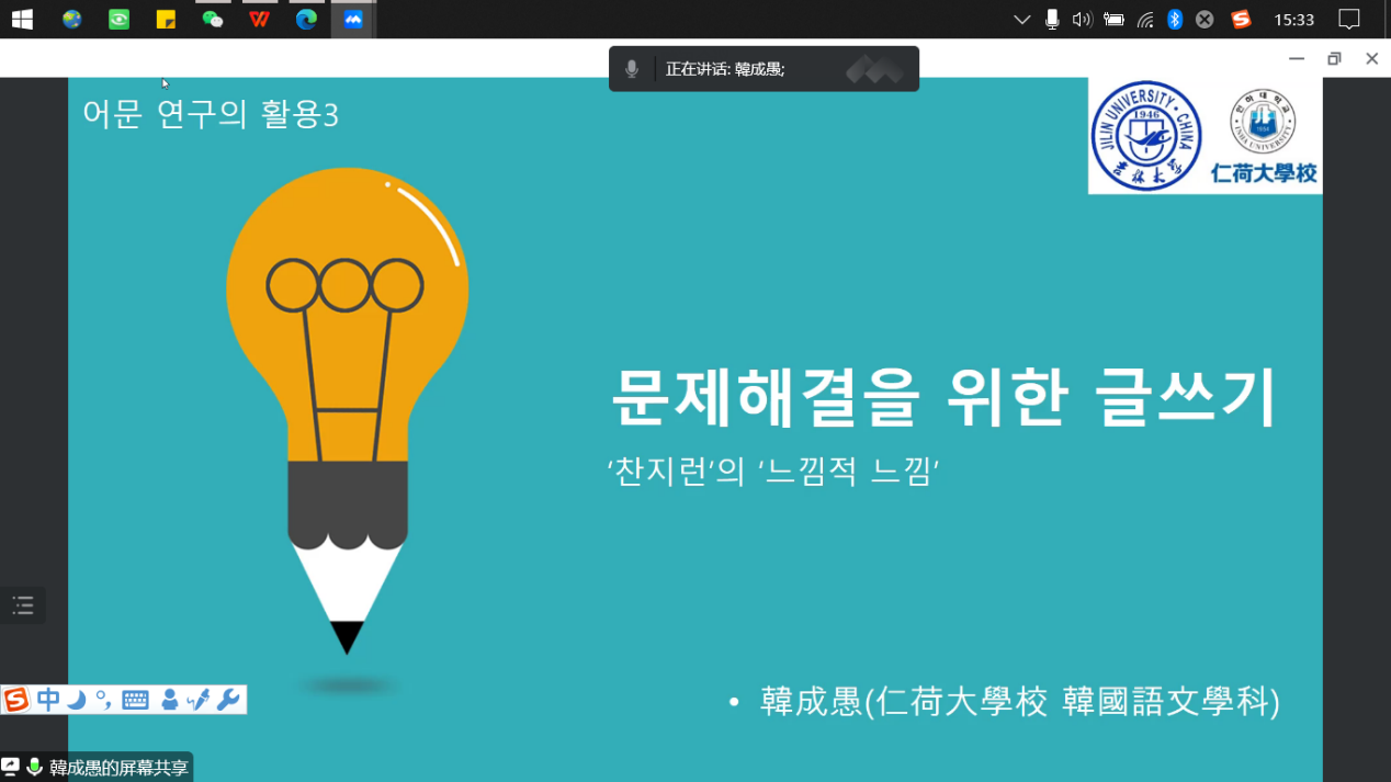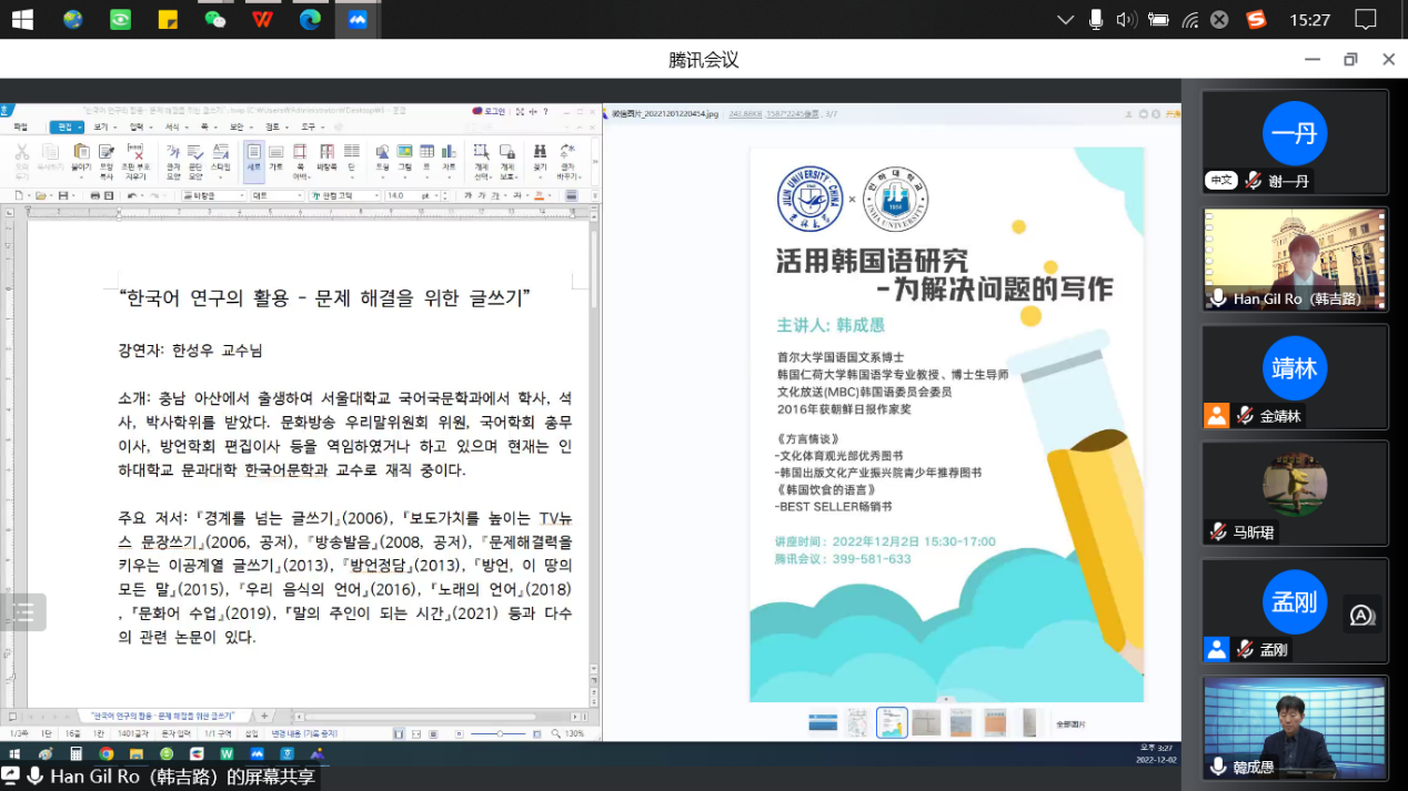邀请,2022年12月2日15时30分,首尔大学国语国文系博士、韩国仁荷大学韩国语学专业教授、博士生导师、文化放送(MBC)韩国语委员会委员、2016年朝鲜日报作家奖获得者韩成愚老师在云端通过腾讯会议平台做了一场主题为“活用韩国语研究——为解决问题的写作”的学术讲座,讲座由朝文系外教韩吉路老师主持,参加讲座的人员有欧美色情片