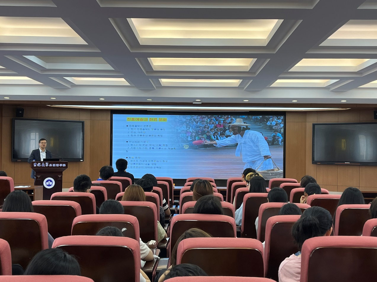 张国强教授首先简单地向同学们解释了何为“新文科”,然后介绍了中韩两国文化的联系,紧接着向同学们介绍了韩国文化的内容及特点,最后以《韩国文化》为例对新文科视域下的区域国别知识学习进行了总结。张国强教授在讲座中强调:中国朝鲜语教育在近80年的发展历程中始终回应时代需求,响应国家号召、服务民族复兴,新时代对朝鲜语专业培养富有家国情怀、代表中国立场、推进文明交流互鉴的新文科外语人才提出了新的要求。关于朝鲜半岛区域国别知识的学习,要持文化相对主义观点,立足于汉字文化圈的背景理解传统文化,通过与韩国传统文化的比较来反观、诠释、理解中国传统文化。