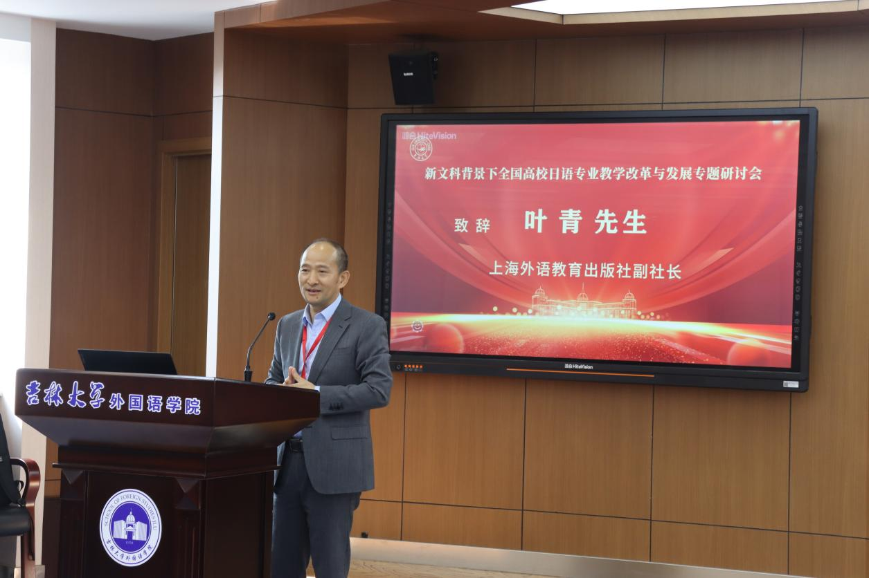 党委常委、副校长张国兴教授,教育部高等学校外国语言文学类专业教学指导委员会日语分委会主任委员、中国日语教学研究会名誉会长、天津外国语大学原校长修刚教授,教育部高等学校外国语言文学类专业教学指导委员会日语分委会委员、中国日语教学研究会会长、广东外语外贸大学东方学研究院院长、广东外语外贸大学日语语言文化学院名誉院长陈多友教授,上海外语教育出版社副社长叶青先生在开幕式上致辞。