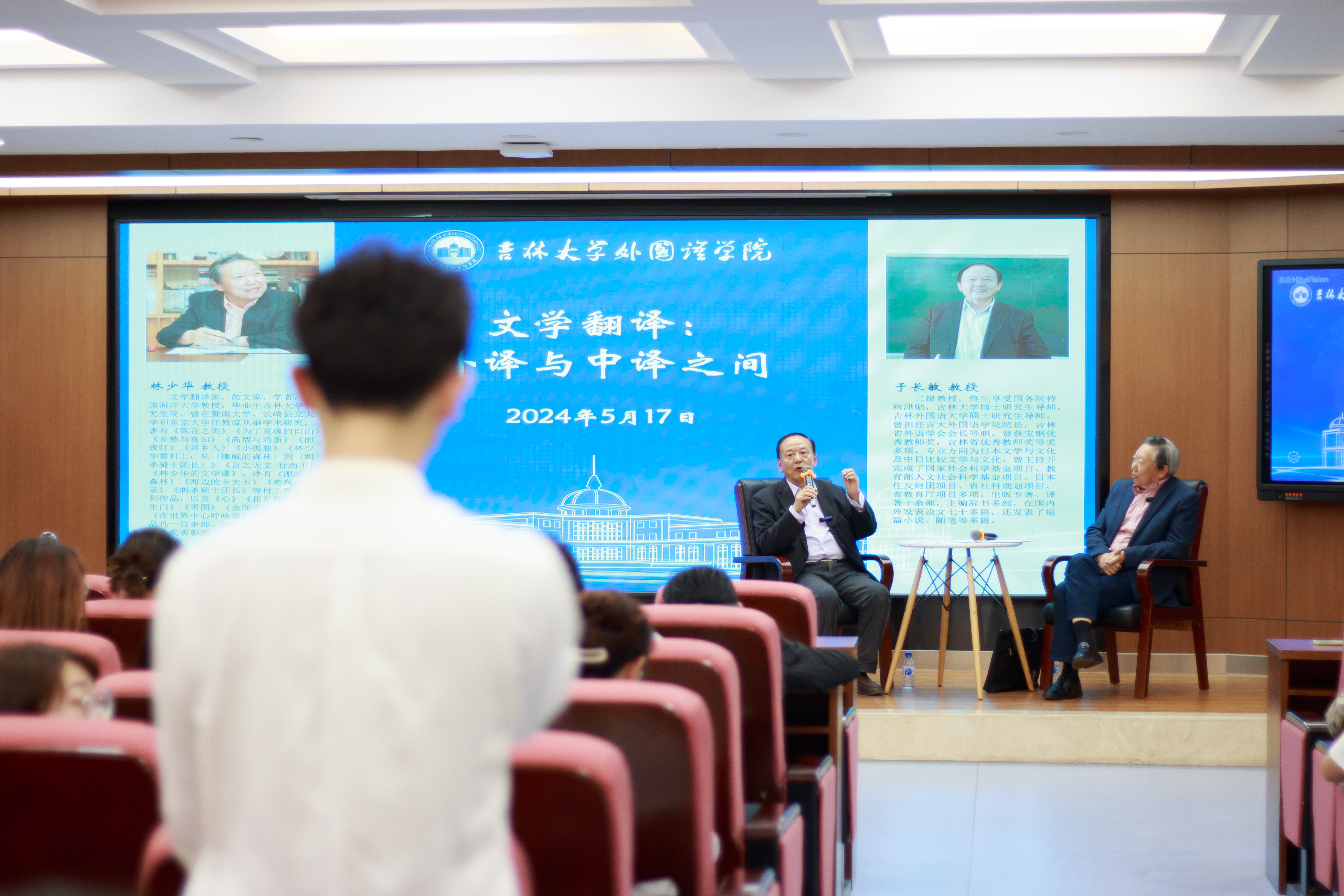 副院长房颖老师主持。两位名师以《文学翻译:外译与中译之间》为题开展了高水平探讨。于长敏教授广引实例,强调了在汉译日场景中汉语水平、日语水平以及对文化背景知识的深入掌握三者缺一不可。林少华教授则以日译英为对照组,分析了中国译者在日译汉场景中的优势与劣势,强调了译本中艺术情韵的重要性。面对当今AI技术给翻译行业带来的冲击,两位教授均表示AI未来虽可做到“信”和“达”,但难以在“雅”的层面超越人类,完全取代人工文学翻译。