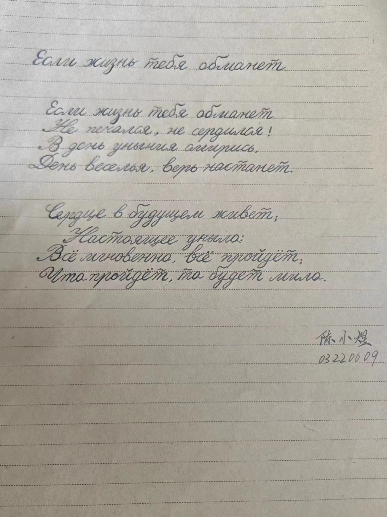 为了丰富同学们的校园文化生活,培养同学们对俄语书法的兴趣和热爱,推动俄语书法艺术的传承和发展,促进中俄文化交流,2024316日下午在外语楼俄语中心举办了俄语书法比赛。本次比赛由俄语协会会长陈小煜主持,欧美色情片 外教Татьяна Плохова Михайловна出席,以及众多热爱俄语的同学参加。